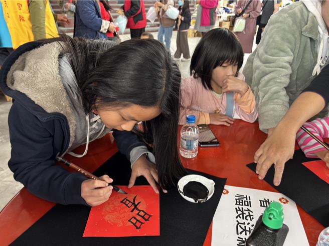 活動邀請3名書法家包括校長周基山、老師周顯榮、陳秀如到場書寫春聯,限量100份,也提供民衆自寫春聯。許多幼兒在父母協助下,體驗首次書寫春聯的新鮮感,現場還有手繪燈籠活動,彩繪後的燈籠將懸掛在廟中。