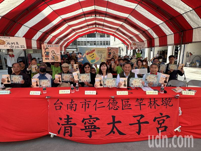 臺南市仁德清寧太子宮成立宋江陣40多年,永福國小老師張淑賢收集廟方宋江陣相關文史紀錄,先完成「清寧太子宮宋江陣文史紀錄」、再請仁德國小與歸仁地區學生彩繪,今天在廟前廣場舉辦「藝陣薪傳圖文並茂」繪本新書發表會。1400多本廟方分送相關廟宇及仁德各國中小學、臺南市各圖書館。