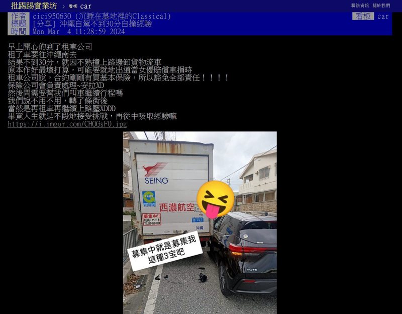 今日有一名網友在PTT Car版上發文寫道:沖繩自駕不到30分自撞經驗。內容描述他抵達沖繩後準備租車自駕遊,但不到30分鐘就撞上路邊貨車,還好有買保險因此不用賠償。但此舉遭許多網友譴責,主要是因爲原PO一副事不關己的態度,加上這起車禍實在是很誇張的駕駛技術問題,因此引來大家的怒火。