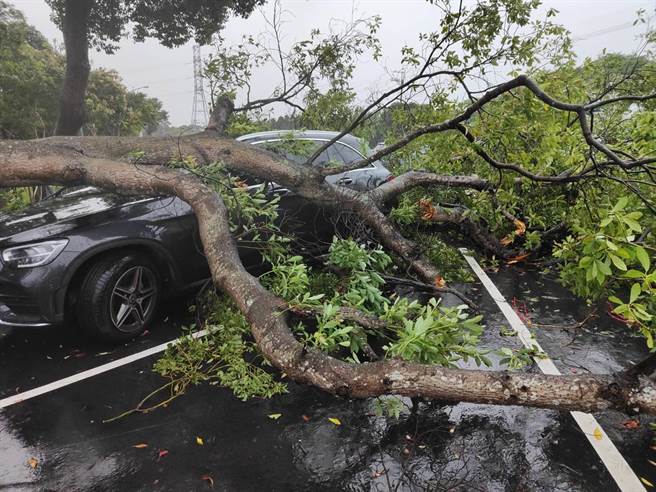 豐原警方昨日15時58分許接獲報案,豐原高爾夫球場停車場內有大樹壓到車子,翁子所警員廖辛根、莊鎧寧獲報後立即到場瞭解,現場爲強降雷雨致路樹斷裂,而私人停車場內有兩臺汽車遭圍牆外公園斷裂之路樹壓毀,幸無人員受傷。