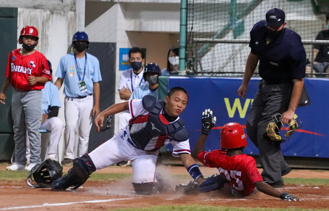 U12世界盃,中華隊捕手陳柏笙2局上將巴拿馬跑者觸殺在本壘前,少丟1分。(中華棒協提供)