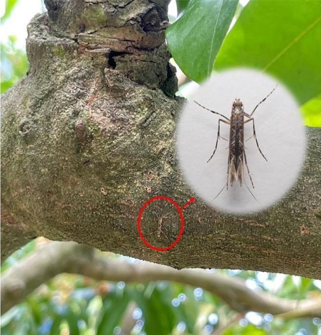 果樹陰暗處之荔枝細蛾成蟲。(嘉義大學提供/林雅惠高雄傳真)