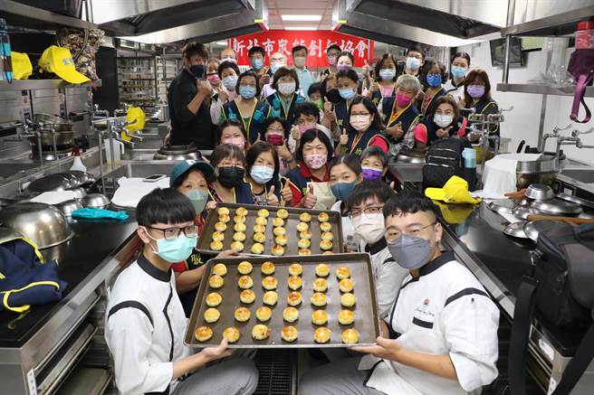 新北市衆能創新協會理事長蔡黃阿員在中秋節前夕動員20多位志工,結合黎明技術學院餐飲管理系師生,一起手作蛋黃酥1800顆,分送給泰山地區的弱勢家庭及獨居長輩。(新北市社會局提供)