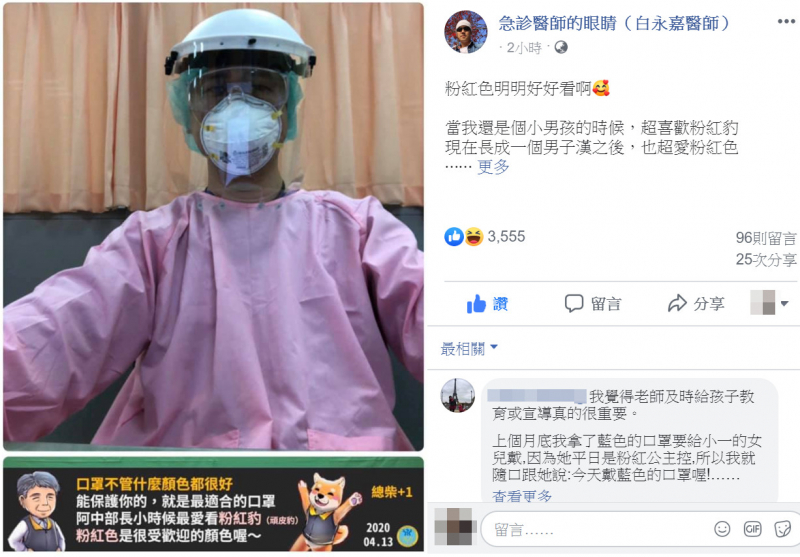 急診科醫師白永嘉也在粉專暖PO示範照,只見他身穿粉紅色防護衣、戴著白色N95口罩及面罩,不解「粉紅色明明好好看啊!當我還是個小男孩的時候,超喜歡粉紅豹,現在長成一個男子漢之後,也超愛粉紅色。」