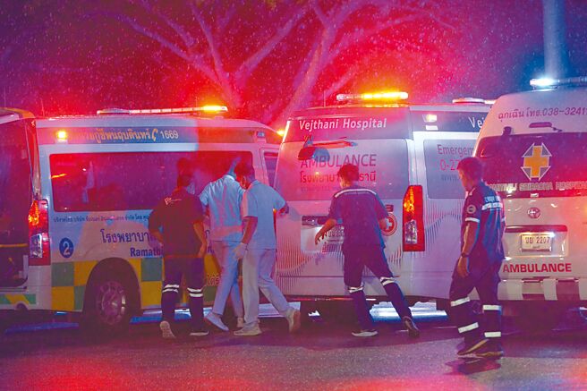 新加坡航空SQ321航班21日緊急迫降曼谷機場後,當地醫護準備將機上傷者送醫。(新華社)