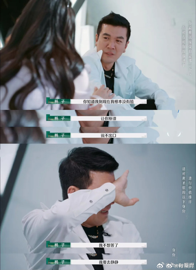 楊子在節目中,坦承自己在夫妻關係中較強勢,甚至連財務大權也是掌握在他手裡,接着他情緒崩潰,對着黃聖依邊哭懺悔,「我從來不哭,就現在開口就流眼淚,就是我覺得以前我所有的做法是沒有人性的,妳懂嗎?」更表示,他以爲自己很善良,「但爲什麼偏偏在你的事情上是沒有人性的」隨後,楊子崩潰大哭:「沒有臉看你」、「不想錄了我想走了」,甚至自責地說:「我到現在根本沒有臉讓妳原諒,我真的太混蛋了」。