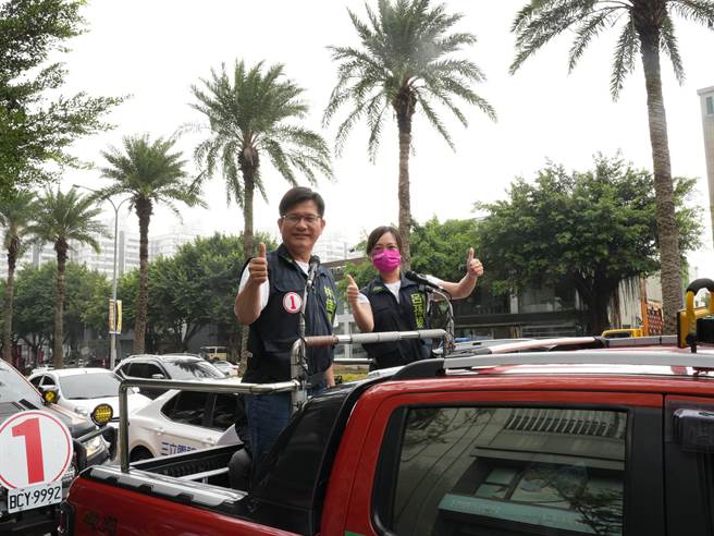 民進黨新北市長候選人林佳龍18日早上前往林口,與賴秋媚、李宇翔合體,在街頭展開車隊拜票。(黃敬文攝)