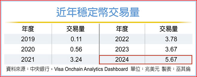 央行指出,穩定幣發展迄今已10年,市面上常見的穩定幣包括USDT、USDC等美元穩定幣,兼具支付功能及代幣化技術優勢,被認爲具發展潛力,近年市值與交易量均持續成長,且應用範圍已擴及實體經濟。