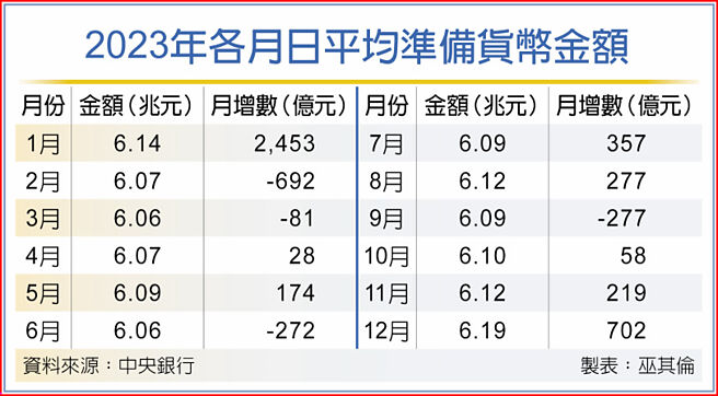 央行統計,12月日平均準備貨幣金額月增702億元,其中流通在外通貨(通貨發行額扣除央行庫存現金)大增261億元,金融機構存放央行準備金也增加441億元。