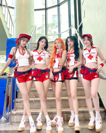 (G)I-DLE於19日表演中變身辣妹救生員,上半身都是無袖露腰,下半身則是激短褲,從當天表演結束在Instagram發出的合照中可見,小娟、薇娟和雨琦的安全褲長度都超過了外面的紅色短褲,而引起爭議的是,她們服裝上有紅色十字的圖案。