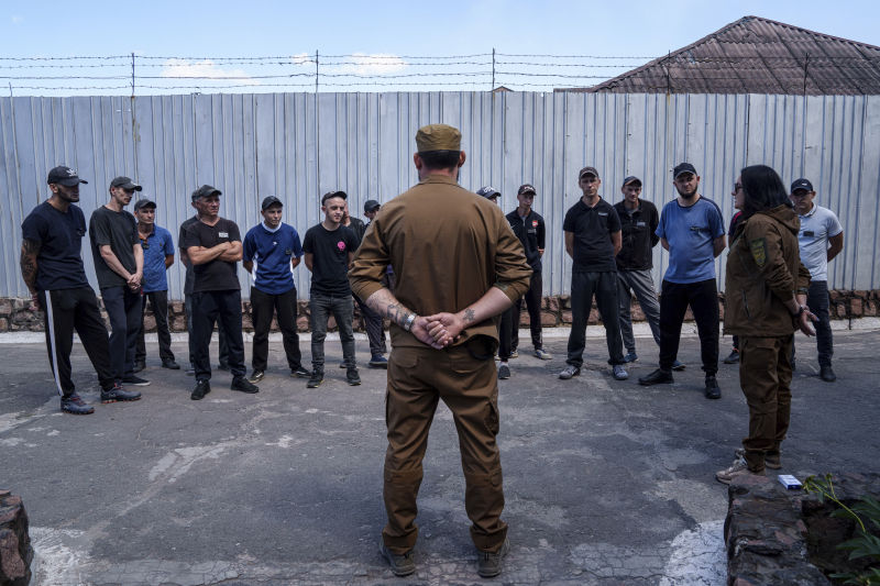 在烏克蘭東南部的一處農村流放地,數名囚犯聚集在鐵絲網下,傾聽一名徵兵人員爲他們提供的假釋機會。他們必須加入對抗俄羅斯的艱苦戰爭,作爲回報。