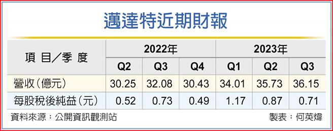 資訊服務商邁達特繼10月及前10月營收創歷史新高之後,第四季因受惠於併購Brainstorm公司,因此,營收可望再向上走揚,第四季及全年營收有機會再創歷史新高。邁達特前三季稅後純益5.17億元,年增61.56%,累計每股稅後純益(EPS)2.75元,創十年新高。