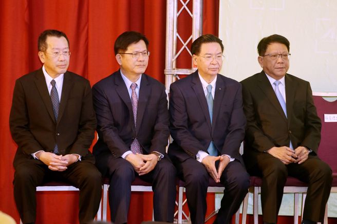 準總統賴清德(左二,背對者)25日公佈第六波新任內閣成員,國防部長顧立雄(左起)、外交部長林佳龍、國安會秘書長吳釗燮、總統府秘書長潘孟安。(杜宜諳攝)