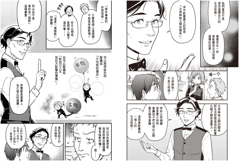 愛書成癡的他表示,每次看書時都會很想一口氣看到最後,或許是因爲那段時間在理髮院看漫畫的經驗才培養出的個性,「書一定要有趣,雖然不常看漫畫,但可以協助讓阿德勒的思想變得有趣,是我決定參與制作的關鍵因素」。