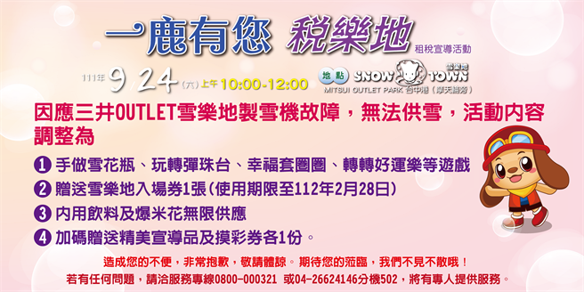 臺中市政府地方稅務局24日上午10時,原在梧棲區三井OUTLET臺中港SNOWTOWN雪樂地舉辦的「一鹿有您 稅樂地」租稅宣導活動。地稅局指出,因雪樂地設備故障,無法供雪,將改以好玩有趣的互動遊戲取代玩雪,陪伴大小朋友度過歡樂的週末。